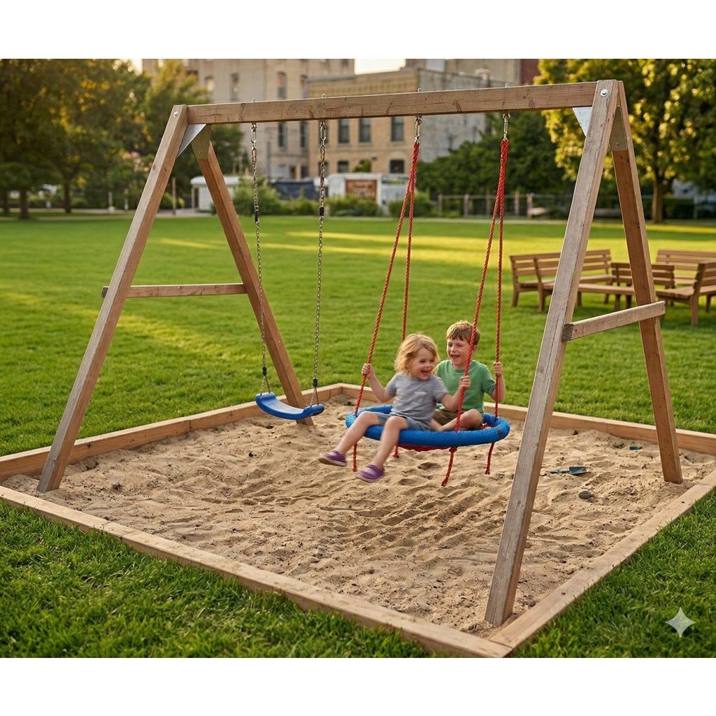 Dětskou, prostorově nenáročnou, dřevěnou houpačku Swingset lze snadno umístit na téměř jakoukoliv zahradu.