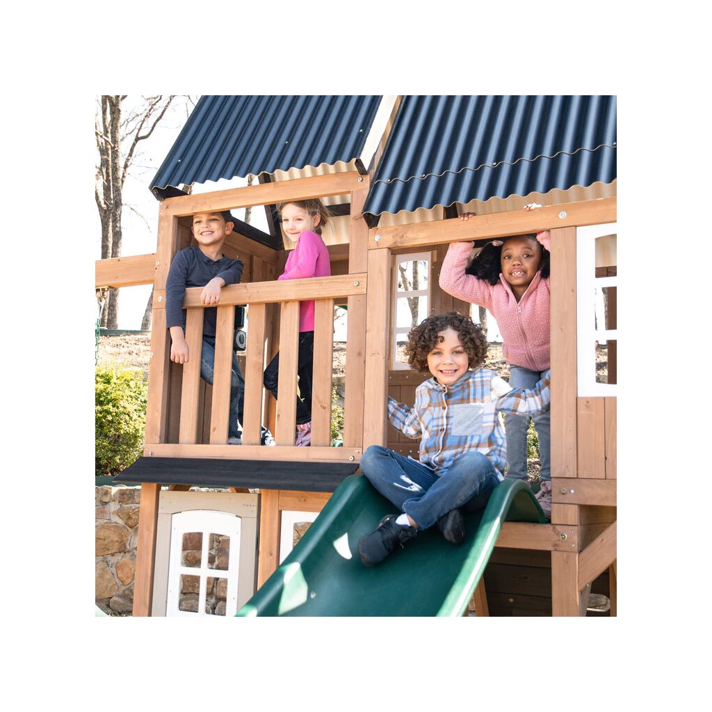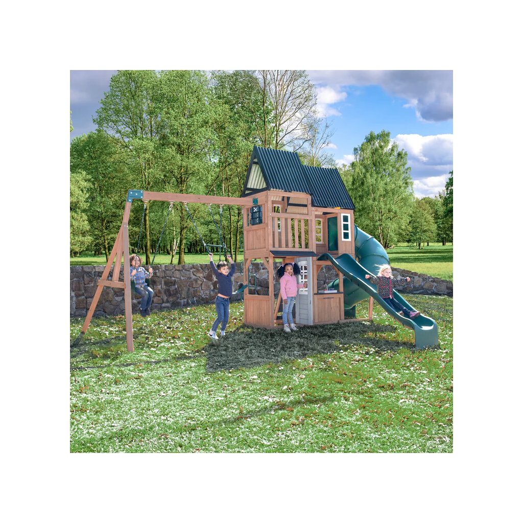Dětské hřiště Acadia Manor s turbo tobogánem a skluzavkou je prémiová víceúrovňová herní sestava vyrobená z luxusního cedrového dřeva, která kombinuje aktivní pohyb s kreativní a tematickou hrou. Díky nadčasovému designu a kvalitnímu zpracování se stane přirozenou dominantou každé zahrady.