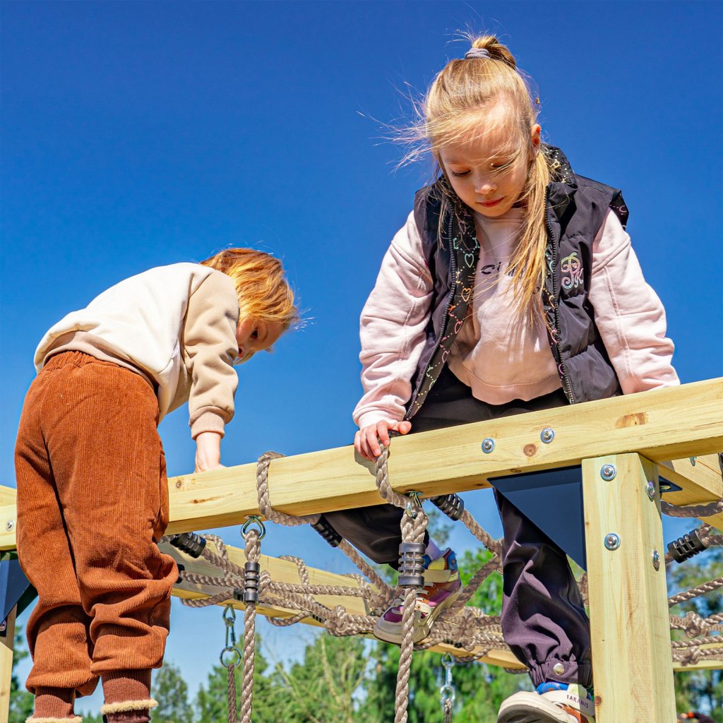 Dominantou sestavy je skluzavka dlouhá 220cm ve výšce 120cm, k ní vedou žebříky, lanový žebřík a šplhací lana, která rozvíjejí sílu, rovnováhu a koordinaci. Ručkovací prvky a gymnastické kruhy posilují paže a záda, zatímco lanová síť podporuje odvahu a sebedůvěru.