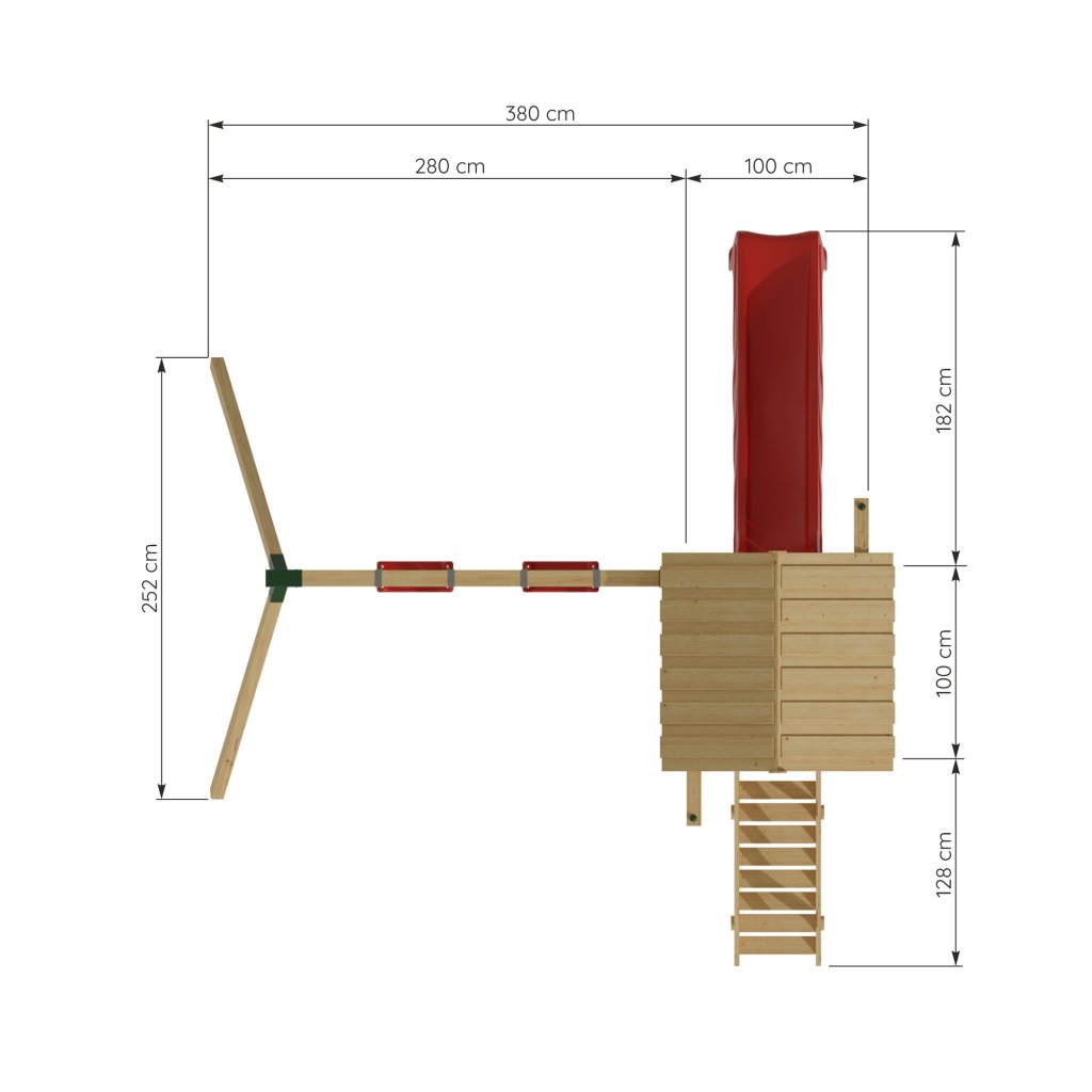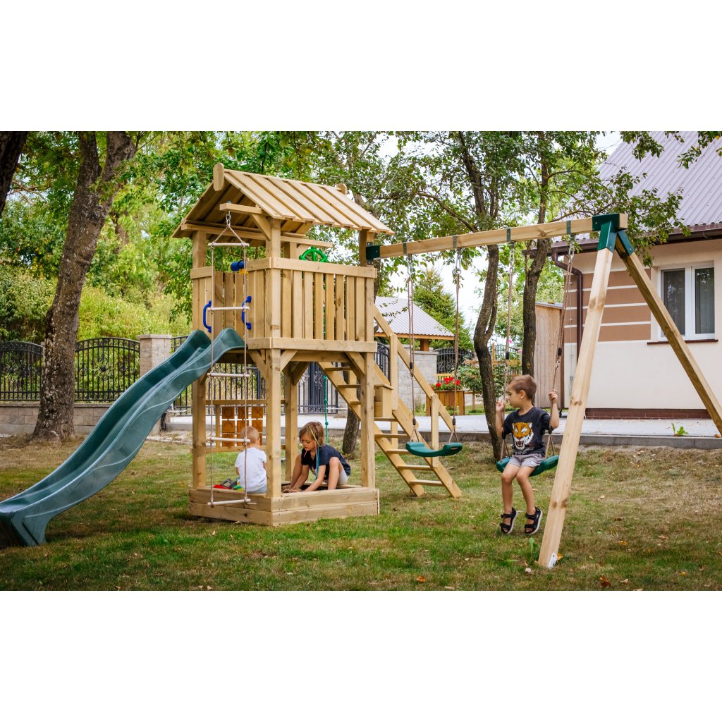 Sestava je vybavena vyvýšeným domečkem s podestou ve výšce 128 cm, ze které mají děti krásný výhled do okolí a pocit vlastního útočiště. Z podesty se mohou s nadšením spustit po plastové skluzavce o délce 228 cm, která zaručuje plynulou a zábavnou jízdu.