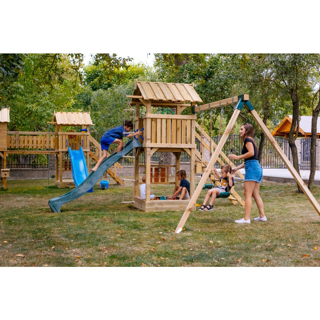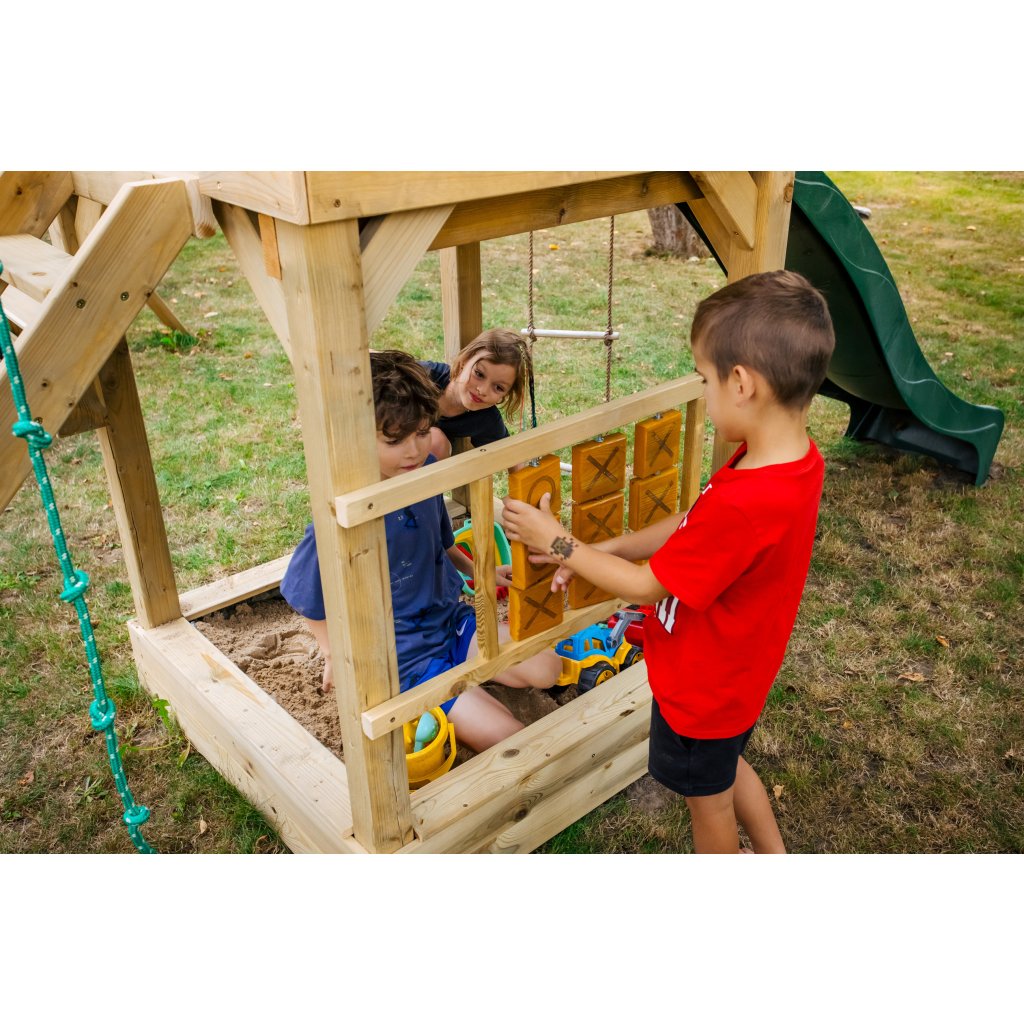 Součástí herní věže je rozšiřující houpačkový modul se dvěma závěsnými plastovými houpačkami, zavěšenými na pevných lanech. Ve spodní části věže děti objeví pískoviště pro smyslovou hru i hrací modul piškvorky, kde si mohou procvičovat paměť a hrát si s kamarády.