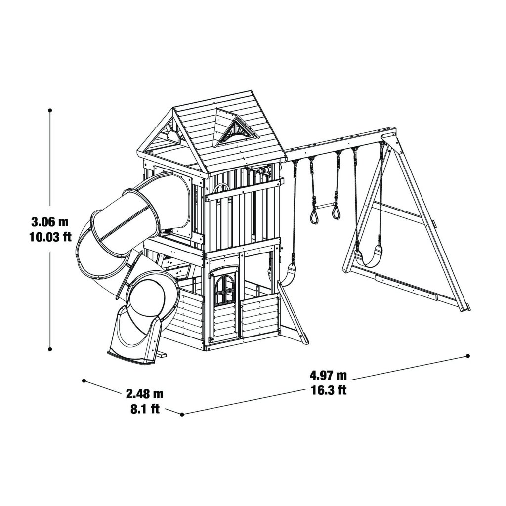 Sestava je vyrobena z kvalitního certifikovaného dřeva a designově kombinuje turbo tobogán a masivní houpačkový modul se dvěma závěsnými houpačkami a hrazdou Monkey Bar, která podporuje sílu a koordinaci dětí při hře.