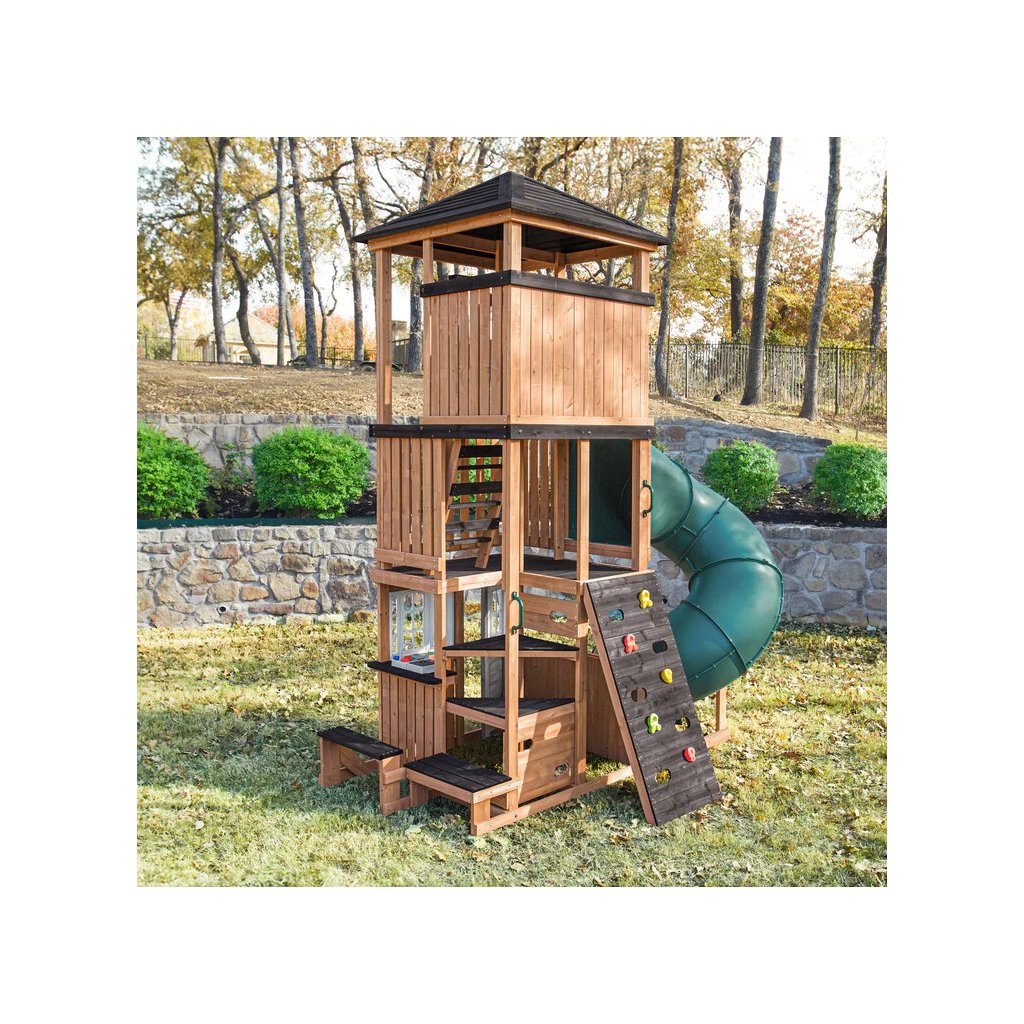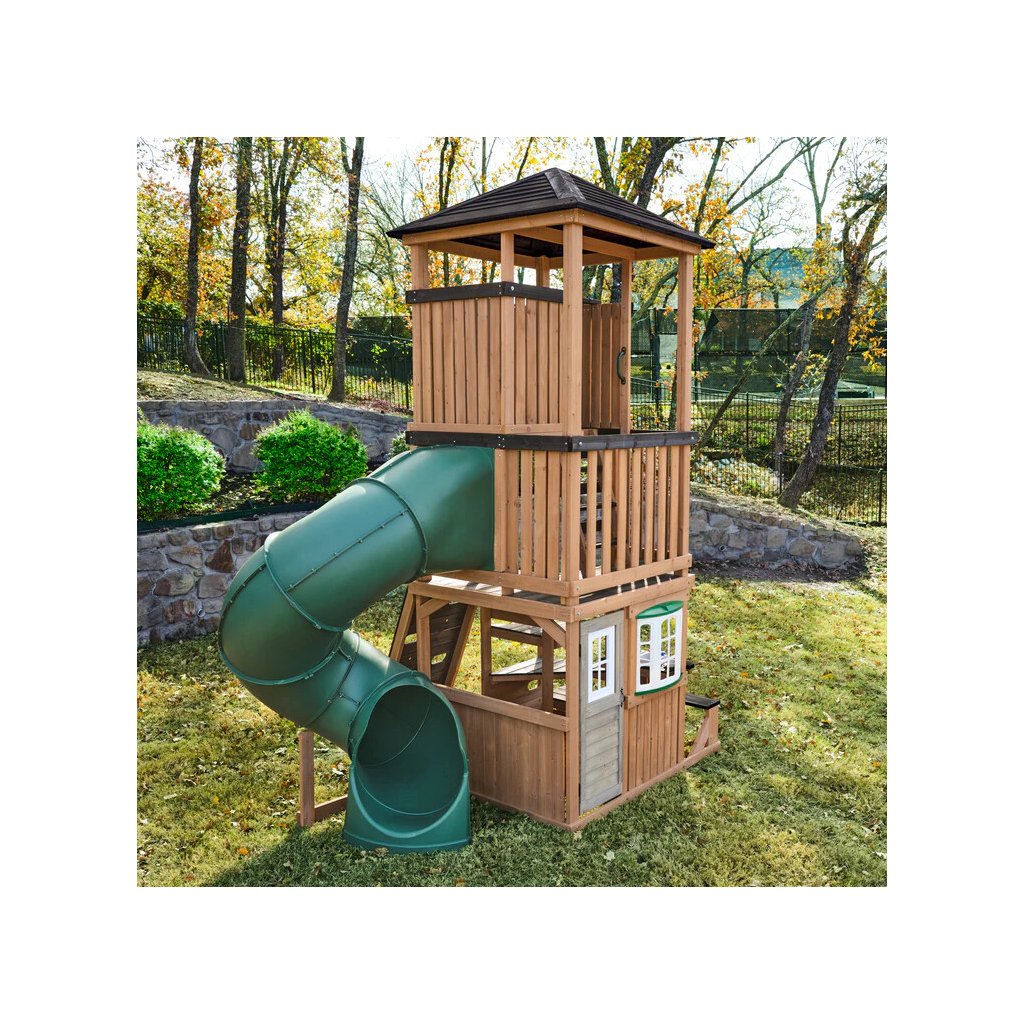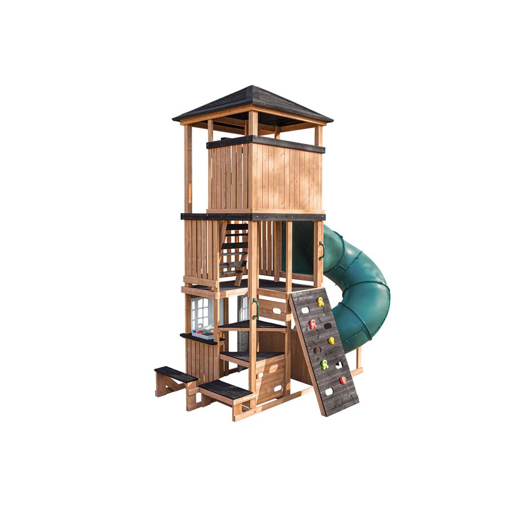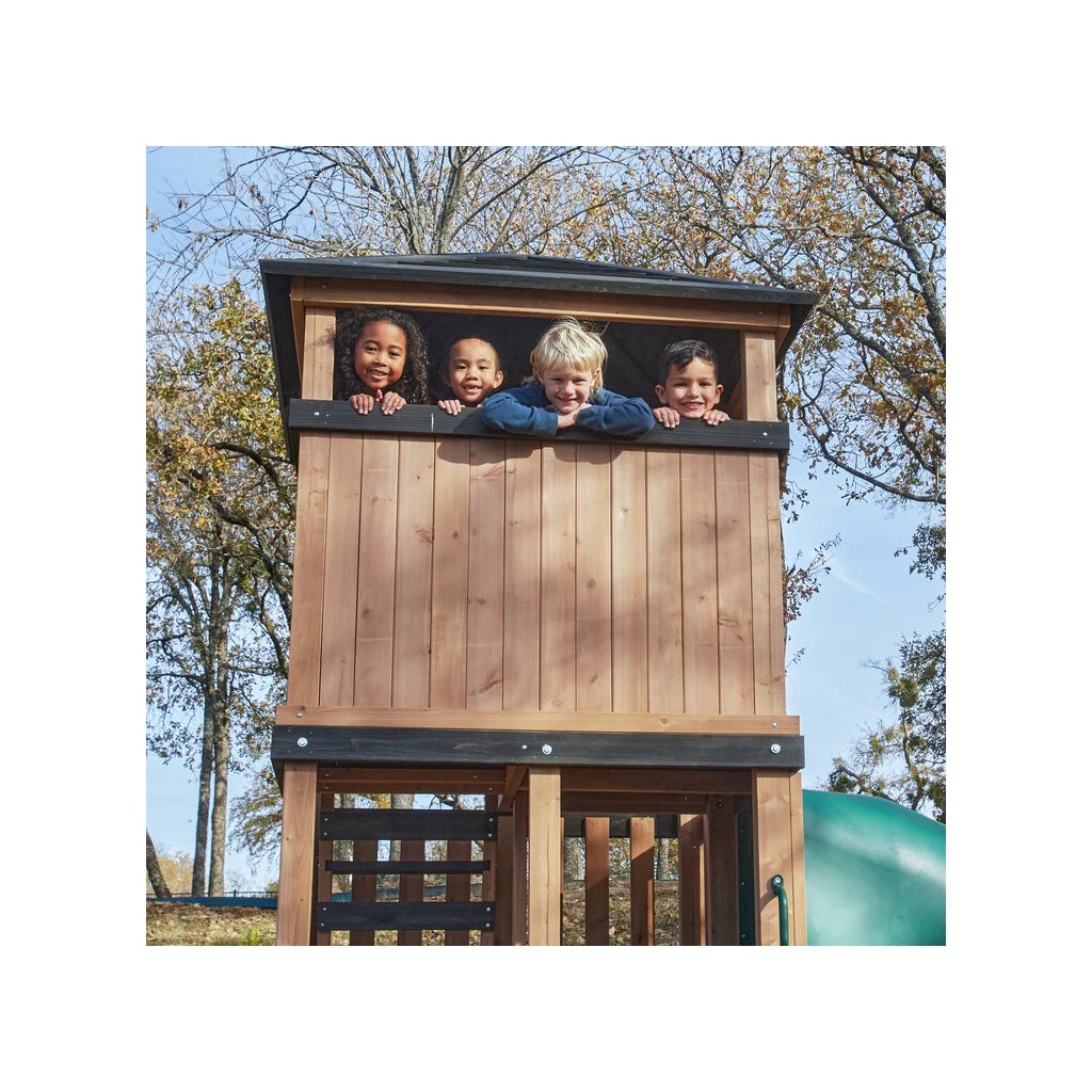 Panorama Tower je výrazné víceúrovňové dětské hřiště, které promění zahradu v místo plné pohybu, radosti a objevování. Dominantou celé sestavy je vysoká věž se zastřešenou vyhlídkou a dlouhý turbo tobogán o délce 365 cm, který je umístěn na podestě ve výšce 150cm dětem nabídne svižnou, zábavnou a bezpečnou jízdu.