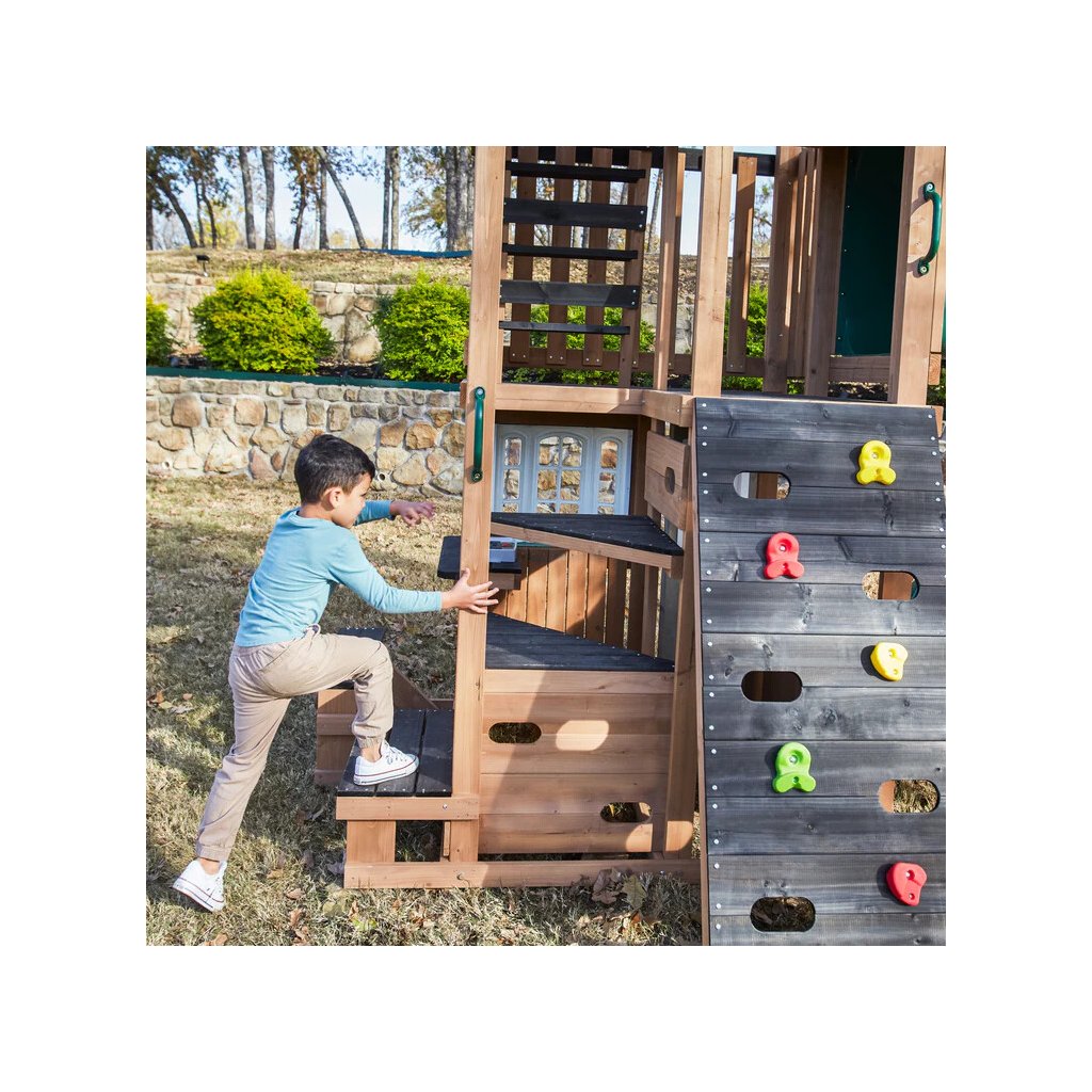 Hřiště je navrženo tak, aby podporovalo přirozený pohybový rozvoj dětí. Lezecká stěna s barevnými úchyty rozvíjí sílu, koordinaci i rovnováhu, zatímco jednotlivá patra a schody pomáhají budovat jistotu pohybu a orientaci v prostoru. Vyvýšená věž se střechou slouží jako ideální místo pro hru i odpočinek.