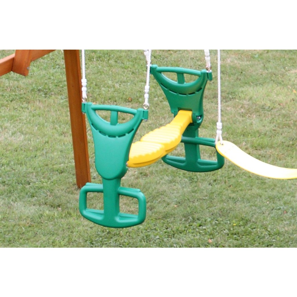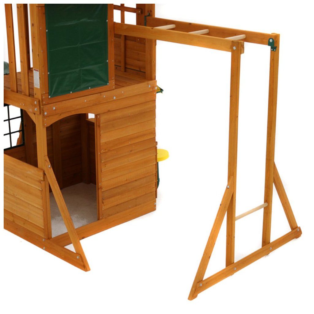 Součástí herní věže je rozšířující houpačkový modul, na kterém je umístěna dvousedačková houpačka Duoswing a dva houpačkové sedáky. Všechny plastové části jsou z celoprobarveného, stálobarevného, UV odolného plastu pro celoroční užítí venku. Z druhé strany je herní věž rozšířena o ručkovací modul, který je z dřevěného cedrového materiálu, vaše děti mohou zlepšovat svoji fyzickou zdatnost. Zemní kotvy jsou také součástí dodávky, aby sestava byla v terénu bezpečně uchycena.