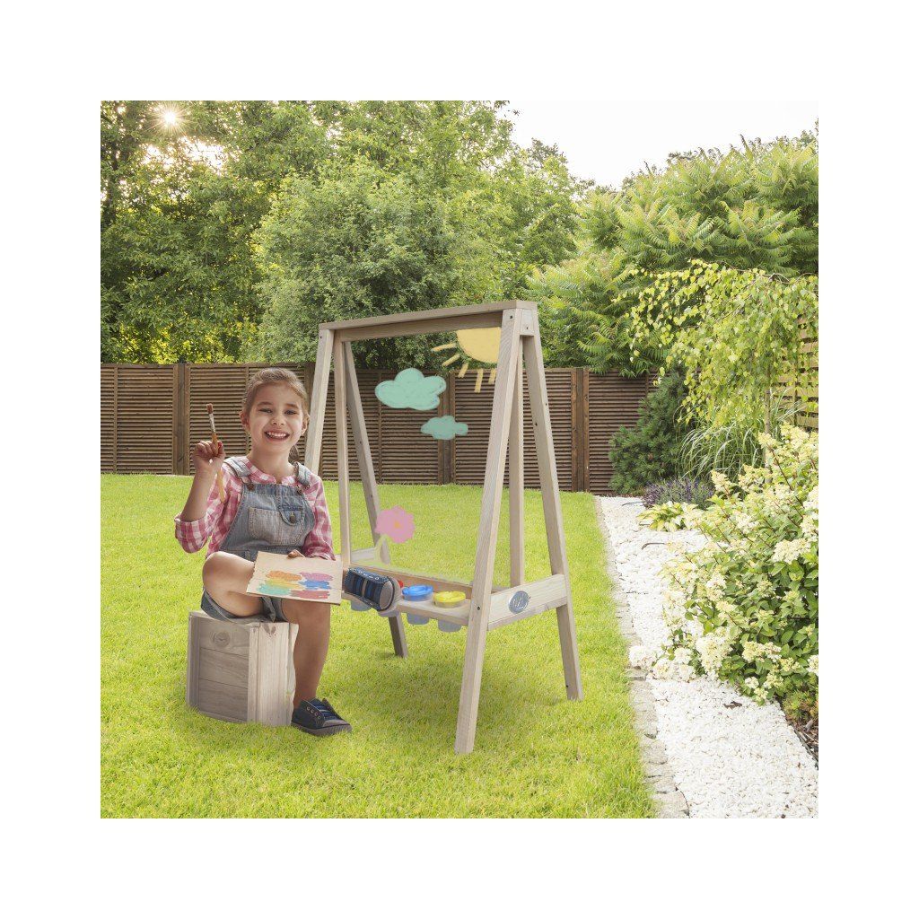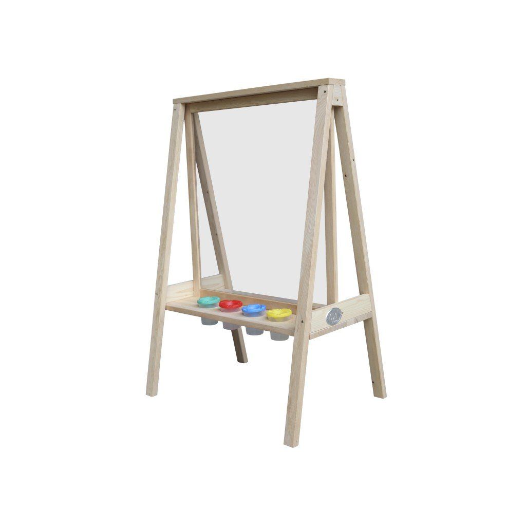 Tabuli lze umístit ven na zahradu nebo do dětského pokoje díky stabilní dřevěné konstrukci. Malovací plocha je tvořena průhledným plexisklem, z obou stran je odkládací pultík na barvy a štětce, tabule tak umožňuje malování i dvou dětí zároveň
