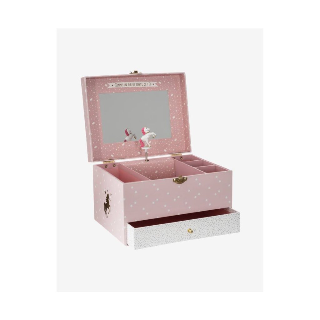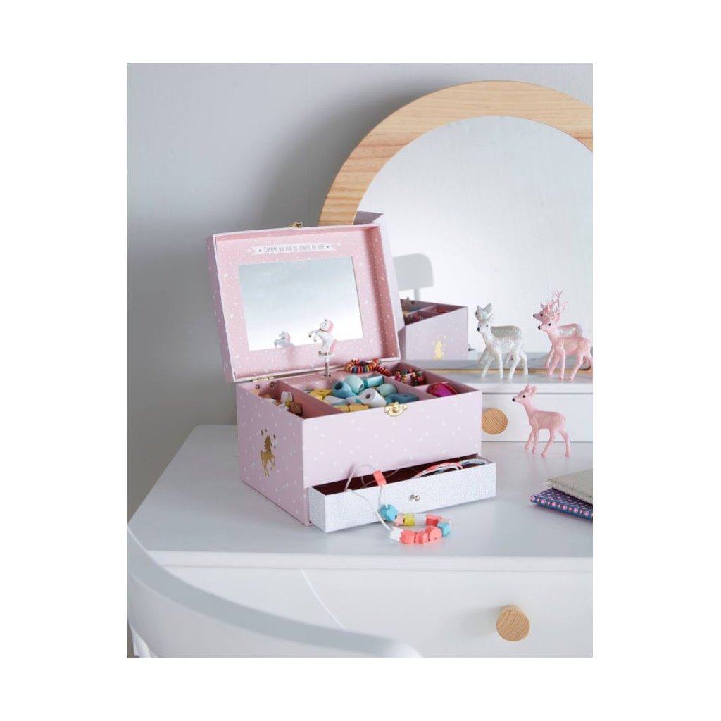 Hrající šperkovnice s jednorožcem a zrcátkem. Své oblíbené náhrdelníky a šminky si mohou uklízet do své šperkovnice, která jim při otevření bude hrát a jednorožec se začne otáčet.