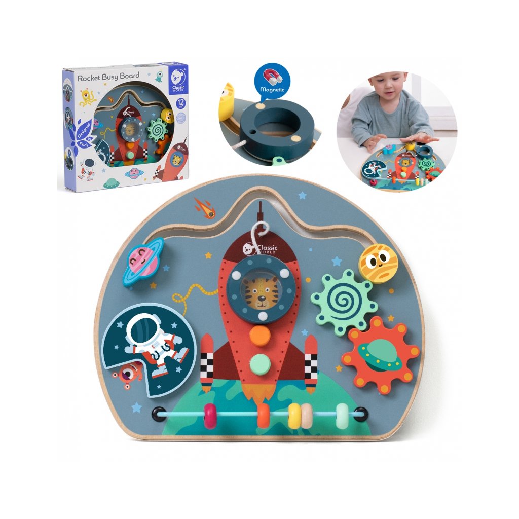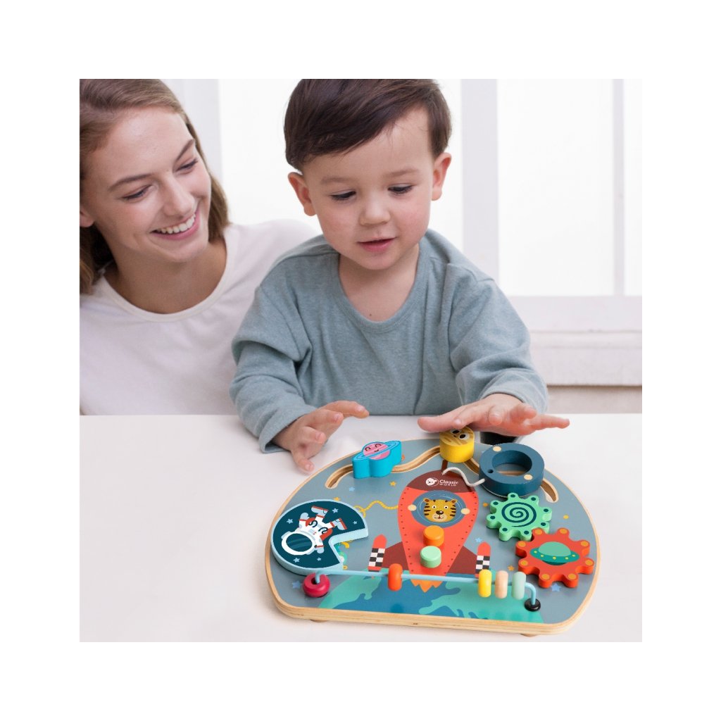 Deska obsahuje bludiště, korálky, otočné kolečko, knoflíky, magnetický prvek a knoflíky, které upoutají pozornost vašeho nejmenšího na celé hodiny.