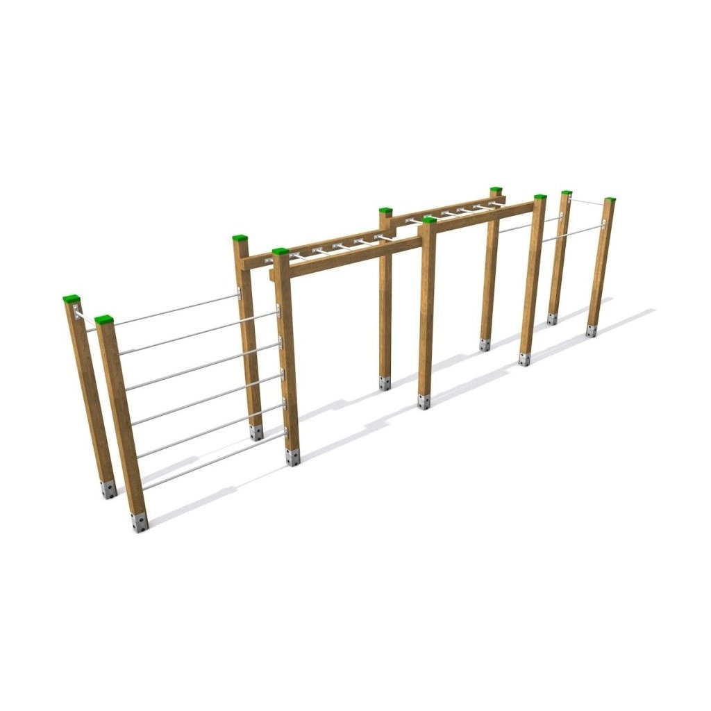 Venkovní fitness - workoutová sestava A je vyrobená z impregnovaných masivních lepených hranolů 12 x12 cm, které jsou z vrchní části opatřené plastovou krytkou, která zabrání pronikání vody do dřeva. Hranoly jsou pomocí ocelových a pozinkovaných 70 cm dlouhých kotev pevně zabetonovány do země. Na této sestavě cvičenci jistě ocení kombinaci několika cvičebních prvku v jedné sestavě - žebřiny, hrazdy, bradla a 2x vodorovný ručkovací žebřík.