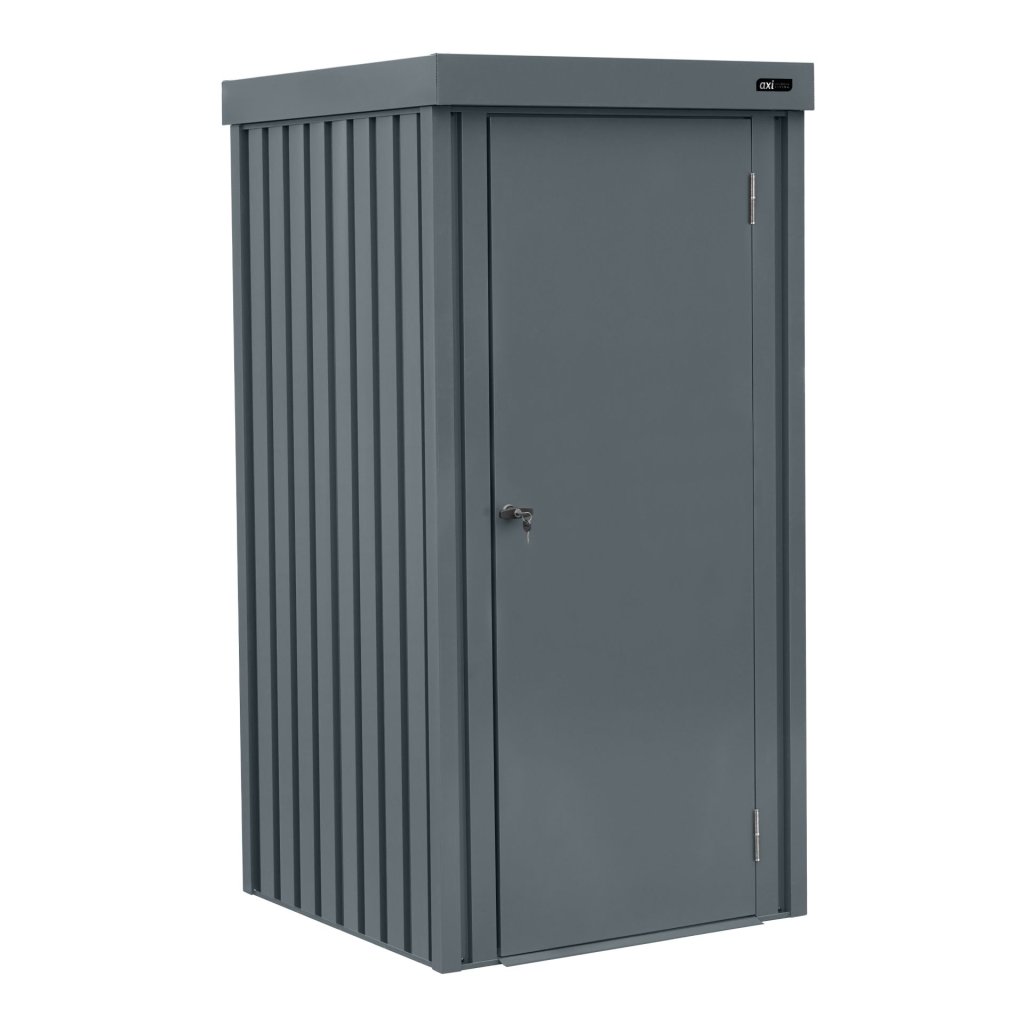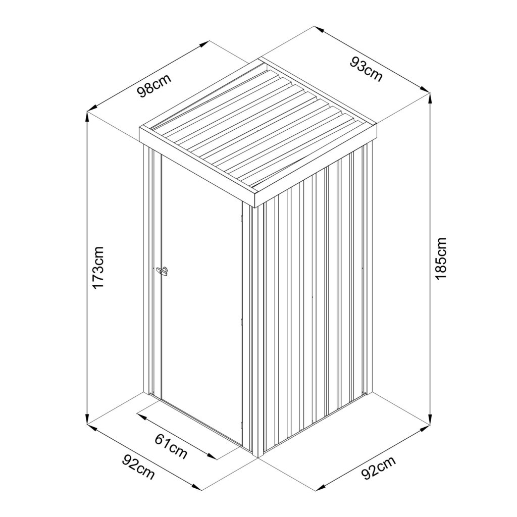 Skříň má šikmou střechu, díky které voda stéká dozadu, a dvoukřídlá kovová vrata se zámkem a 2 klíči zajišťují bezpečné uložení vašich věcí.